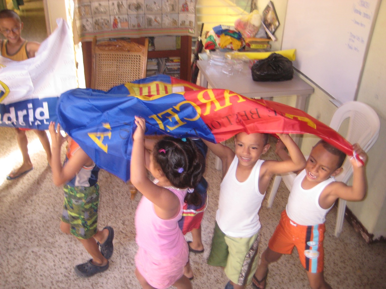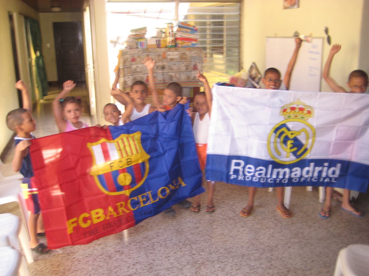 So this weekend Barcelona play Real Madrid in the Spanish “La Liga”. The equivelant of Yankees vesus Red Sox in the states. Everyone in this country likes one team or the other. So on my way over to Robles today I saw a guy selling these huge flags at the redlight. Of course I bought one each to bring by the house!!!