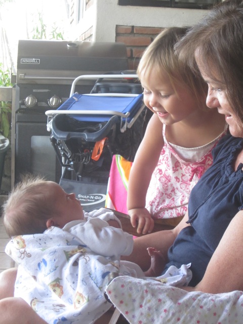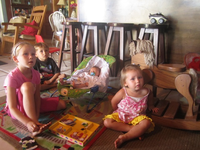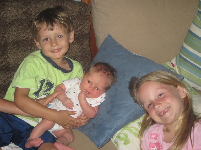We got a few cute pictures of Juliette this past week with her brother and sisters. She is really being a good baby. Of course she isn’t sleeping through the night or anything yet, but she is basically eating and sleeping and pooping…when she cries it is brief. We are happy parents so far…..things could get crazy any day now though 🙂